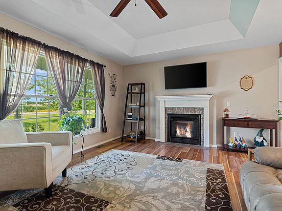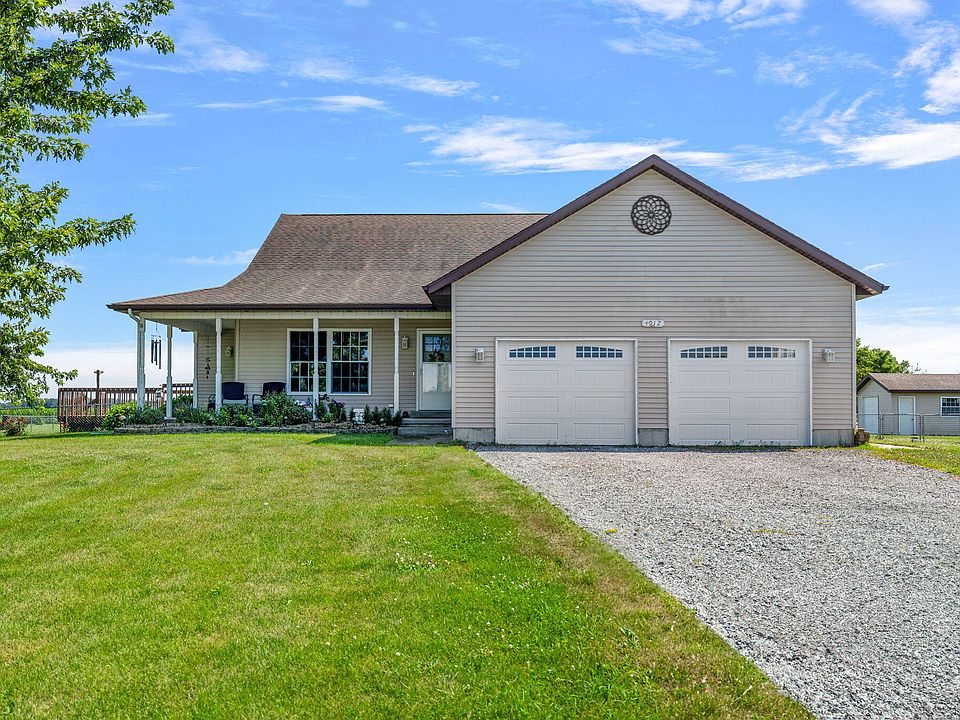Don't miss out on this beautiful 2013 built daylight ranch that sits on a 2 acre parcel. Featuring 1588 sq ft on the main, this spacious ranch has been tastefully decorated and updated throughout the years. The inviting covered, wrap-around front porch is waiting for you to enjoy your morning coffee. Upon entering you are greeted by the spacious living room featuring tray ceilings, an abundance of natural light and gas fireplace. The living room opens up to the HUGE eat in kitchen featuring a stainless steel appliance package, glass mosaic backsplash and access to the front porch and back deck. The Primary Suite features vaulted ceilings, a walk-in closet, sliders to the back deck and a private bath with vaulted ceilings, jetted tub and stand alone shower. There are two additional sizable bedrooms, a full bath and delightful laundry/mud room also on the main level. The daylight basement which is accessed through the attached 2 car garage is perfect for related living, featuring an abundance of windows, a kitchenette and 3/4 bath. Currently there is tons of storage in the basement with even more potential for future living space. The backyard is fully fenced and has an outbuilding for all of your lawn tools. Enjoy country living with easy access to neighboring communities of Westville, Valparaiso, La Porte, Michigan City, South Bend and beyond! This is a one owner home that has been meticulously maintained. Book your private tour today!