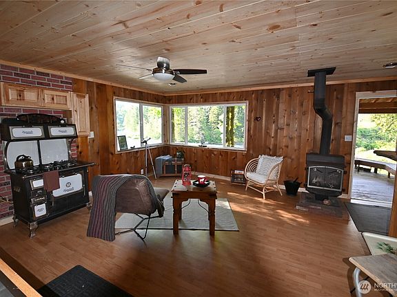WATERFRONT MTN VIEW PROPERTY ~ 130 ft of prime riverfront on .73 acres. This private retreat includes two charming cabins, perfect for full-time living, vacationing, or short-term rentals. {Cottage} open concept, lg picture windows, kitchen, 1/2 bth, antique gas stove, wood stove, hot tub and spacious deck w/stunning views. {Bunkhouse} a versatile cabin w/full kitchen, 1/2 bth, 2 flex rooms, live edge bar, view deck(s) ideal for guests. Detached washhouse w/infrared heater, on demand, enclosed toilet & laundry. Upgraded roofs, permitted 4C 200-amp panel, Generac's w/auto switch, remote heating/fans, led, LVP, windows, decks & more. Conex offers 20' apt/20' storage. {2} EV charging/RV/tent spaces/tons of prkg. Home to WORLD-CLASS recreation!