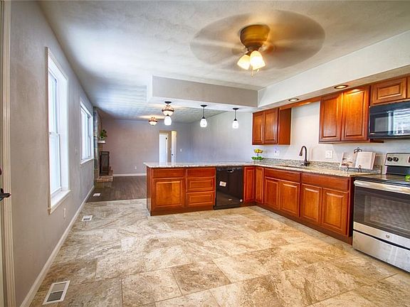 Totally remodeled 4 bed, 3 bath, low maintenance ranch with full finished basement, 2 car garage, fenced back yard with pool. Granite counter tops, new wood cabinets, new black/stainless steel appliances, new ceramic and carpet throughout, new electric lighting and plumbing fixtures, walk in closets, covered front porch, covered back patio, fire-pit, 29x23 barn with cement floor and water spickett. Fruit trees in back acreage backs up to field. Lower level has office, laundry room, play room and rec room spaces.
