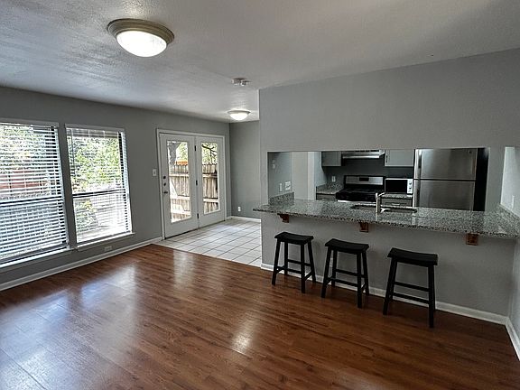 - 2 Large Bedrooms & 1.5 Baths (Approximately 1,100sf) - Quiet neighborhood - Energy Efficient A/C & Heating System (Lower Bills) - S/S Appliances (Gas stove, Dishwasher, Refrigerator) - Granite countertops - Ceiling fans in bedrooms - Tile Entry, Kitchen, Utility Room, and both Baths - Laminate and Hardwood flooring in the living room and bedrooms - Fireplace - Large Deck off Primary Bedroom - French Doors to Primary Bedroom Deck - Walk-in Closets/Under stair Storage/Kitchen Pantry - Energy-Efficient Windows in Den - Vinyl blinds throughout - Landscaped Entry - Yard Service Included - Covered back patio - Fenced backyard - One-car garage with built-in cabinets Tenant is responsible for all utilities. Security Deposit is required upon signing, pro rated first month rent.