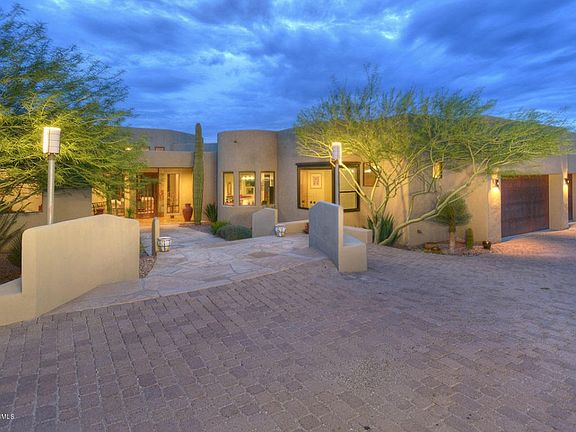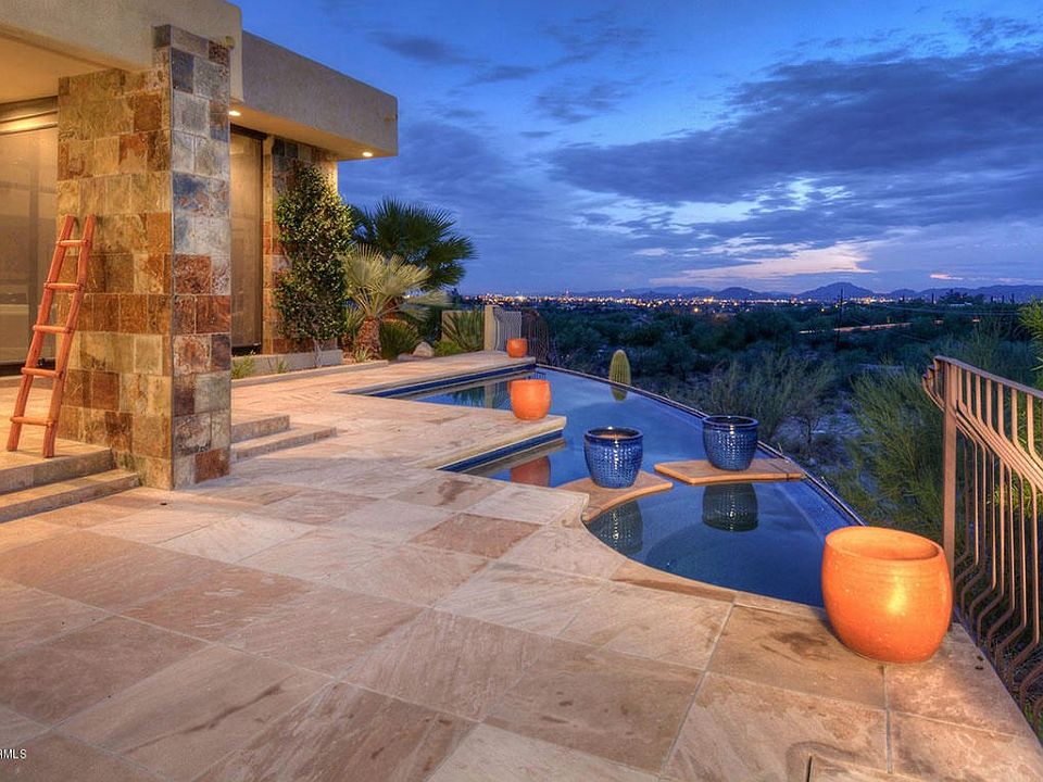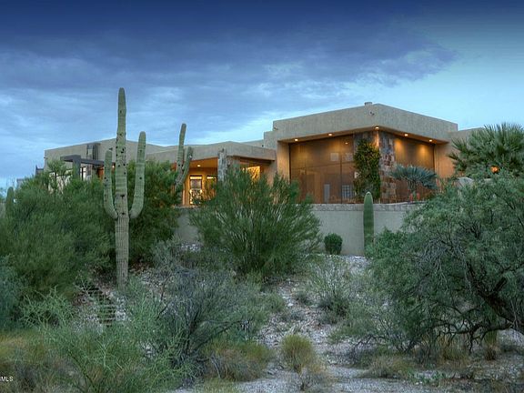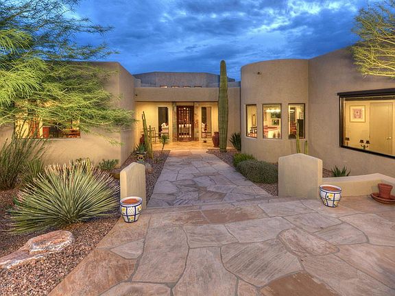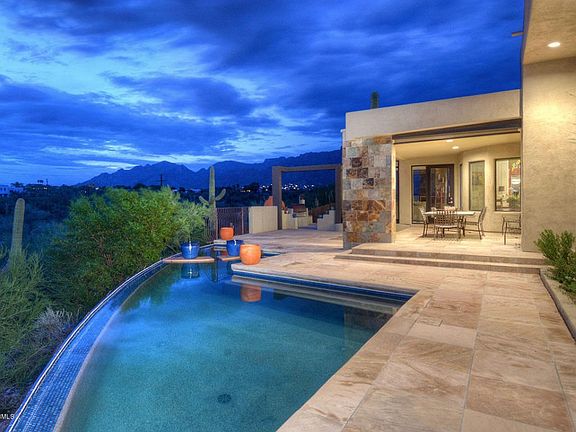 Outstanding soft contemporary on a private cul-de-sac lot in the Catalina Foothills with sweeping city, desert, sunset and Catalina Mountain views. Enter into living room with soaring ceilings, walls of windows, fireplace and travertine floors leading to gourmet kitchen with designer SS appliances, center island, granite counters and family room with fireplace. Gracious master suite offers sitting room and master bath with natural stone surrounds. Large laundry/work room, 3 car garage, professionally landscaped yards and flagstone walkways, covered porches with travertine floors, outdoor kitchen with kiva fireplace, bancos and negative edge pool and spa. Full golf membership to Ventana Canyon Country Club is included with the property.