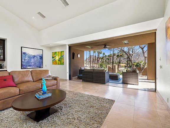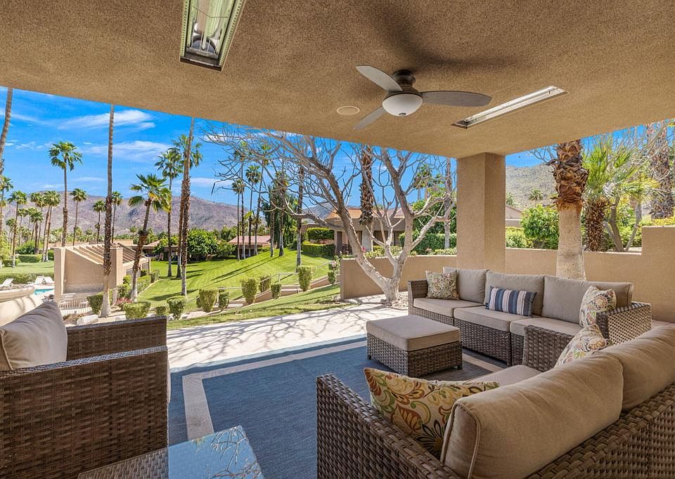 An exceptional remodel by reknown contractor, Russ Clarke. Expanded to 2,665 s.f. free-standing 3 bedrooms and 3 baths. Pocket sliding doors that disappear into the wall offer unobstructed views. The patio is East facing with outstanding views of the mountains toward Eisenhower Peak.. Prime, quiet location. Great room, with vaulted ceilings, striking floor to ceiling stone-faced fireplace with gas starter. The expanded kitchen has quartz countertops, a double stainless steel sink, a Viking gas range, and eating bar seating for 4. In addition there is a formal dining table for 8 plus a casual dining table/game table. There is an inside laundry. The dry bar has a wine refrigerator. 2 of the bedrooms have ensuite baths. Travertine flooring,, surround sound speakers and ceiling fans throughout. Besides the view, the patio offers travertine flooring, a firepit, built-in heaters, and a TV for enjoying a relaxed lifestyle. The large garage features pebble stone flooring and custom storage cabinets. Offered fully furnished per inventory list and ''turnkey''. Art work is negotiable.