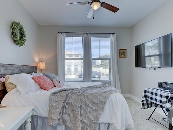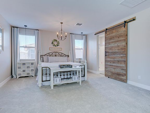 Welcome to your humble abode. This move-in ready 3 bedroom plus a loft 3.5 bathroom home is nestled in the highly sought-after Eastmark Community. The curb appeal this home has to offer is impeccable with it's blue door, HOA maintained landscaping, and modern exterior features. Throughout the home you will notice the neutral paint, desirable open concept, and stylish black hardware. The gourmet kitchen boasts granite countertops perfectly accompanied by the clean white cabinets that provide ample storage space, recessed lighting, reverse osmosis system, subway tile backsplash, soft close cabinets and drawers, single basin stainless steel sink, and a massive pantry. The kitchen overlooks the living and dining space that encompasses a farmhouse chic light fixture above the dining room table. The guest bedroom downstairs is all inclusive and features a gorgeous custom drop zone, updated bathroom with state of the art flooring, and a newly installed ceiling fan. The powder bathroom is the ideal size and has gorgeous details such as the shiplapped wall and artistic mirror. Upstairs you will find the perfectly sized loft area that has a massive linen closet and a window with the most breathtaking mountain views. The laundry room has brand new wood-look laminate flooring (same flooring in both bathrooms upstairs), open shelving, and a motion sensor light switch. The third bedroom also features a motion sensor light switch in the large walk-in closet that also has built-in shelving. Now let's talk about this colossal master suite, the room is filled with luxurious upgrades such as the stunning chandelier above the bed, the ceiling fan, the pendant lights above the night stands, and the custom and very sturdy wood barn door that leads to the master bathroom. This bathroom has it all with it's large shower and built-in seat, dual sink with soft close drawers, and a massive walk-in closet with built-in shelving and windows. One of the best aspects of this home is the jaw dropping newly completed backyard. It's paved patio, astroturf, updated painted walls, newly installed plants on an auto drip system creates an easy to maintain, relaxing, and fun atmosphere. The best part is the garage door that leads into the 3 car tandem garage which is partially insulated, has built-in cabinets, epoxy flooring, and a ceiling fan to help keep it cool. A few other perks this home has to offer is the upgraded exterior holiday lighting and numerous dimmers throughout the home. Just like a world class resort this community offers a luxurious community pool, splash pads, numerous parks spread throughout, the Steadfast farm, the Handlebar Diner, and it's very own state-of-the-art clubhouse "The Mark". The Mark hosts events throughout the year and a wide variety of family friendly games to play. If this home checks off all of your must haves, then come make an offer today before it's too late! Be sure to check out the interactive floorplan too!
