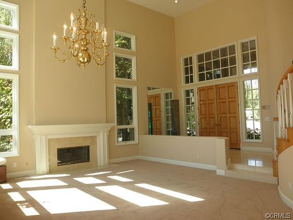 This beautiful corner lot view home overlooks the Yorba Linda hills and Anaheim hills. The unique open floor plan has 30 foot high ceilings in the Living room and Dining area with floor to ceiling windows providing views from each downstairs room. The new large plank wood floors throughout the Family room and Kitchen blend with the rich custom hand made cherry wood cabinets in both rooms. In contrast with the rich wood are the light colored granite counters in the Kitchen, breakfast bar and adjacent step down wet bar. The Family room has a large entertainment center with a flat screen TV and built-in surround sound system. The large upstairs Master Bedroom has a high, coffered ceiling, a sitting area, a grand double door entrance, and sliding glass doors to a large deck that allows a view of city lights, Disney fireworks, and the back yard fountain. The Master Bathroom has black granite counters, an oversize tub, and a large walk in shower. The very large Bonus room connects the two other upstairs bedrooms and has a full bathroom. The main floor office can be converted back to a 4th bedroom and has a 3/4 bath. The beautifully landscaped backyard boasts a varity of plant life, a flagstone patio and 12 foot high stone waterfall.