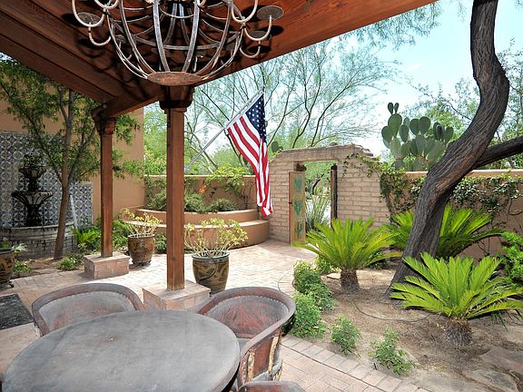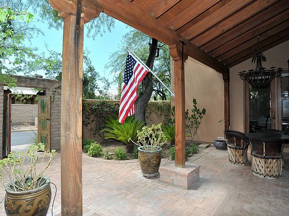 Sought after central Tucson Old Ft. Lowell Historic District within gated enclave of Arizona Territorial homes called The Garrison this home exudes warmth & exclusivity. Adobe walls surround the property and a Talavera fountain welcomes guests in the front courtyard. Twelve foot ceilings, open rooms, viga beams, colored concrete floors, formal fireplace and plenty of natural light create an elegant living space. The large kitchen boast a Viking range, Sub Zero refrigerator, Asko dishwasher and large sculpted granite island. Deep covered patio, lush vegetation, rustic rock fountain and a swim in place pool create an oasis in the Arizona desert. Master suite has fireplace, bath with marble dual vanities, new shower and fixtures. Impeccably maintained and ready to move into.