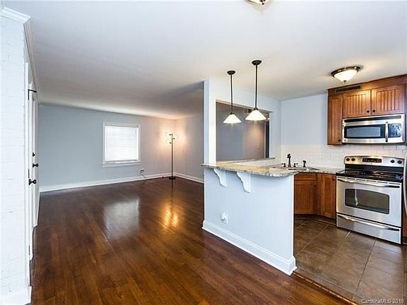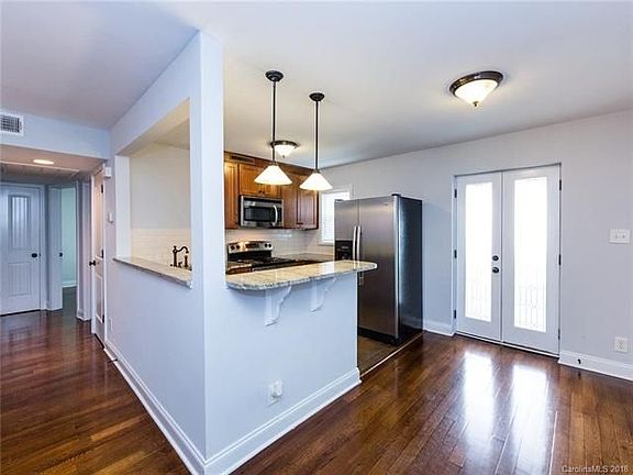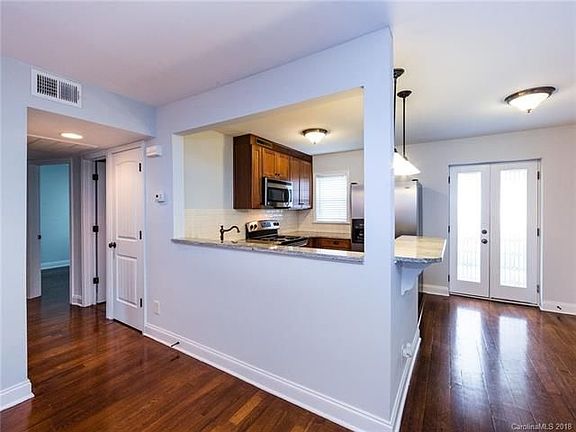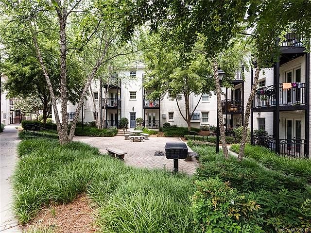 Great 2 bedroom condo with hardwoods and short walk to Montford Amenities and Park Road Shopping Center! Settle into easy living in this condo - all hardwood throughout (no carpet!), tile in baths, granite counters, stainless appliances in kitchen and washer/dryer in unit. Exposed brick, fresh paint, new garbage disposal! Nice terrace to enjoy your coffee and 2 community courtyards and a pool for grilling and socializing! Secure buildings, pool, wireless internet, water, trash and common area maintenance included in HOA! Don't rent! Make this home - come see it today! PS - Building hallways are getting ready to be recarpeted and painted over next 2 months