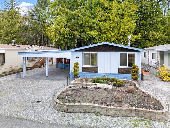Welcome home to Bellingham's most desirable 55+ community. Premier location in the park, situated for all day sun & gorgeous views overlooking the lake from your living & dining room. Meticulously maintained 2 bed, 1.75 bath w/ spacious floor plan & inviting gas fireplace in the living room. Updated kitchen w/ counters & backsplash, oven, induction cooktop & dishwasher. Newer: Laminate flooring, custom blinds & bathroom countertops. Recently re-leveled foundation & 2 car carport. Countless updates throughout the property. Award winning raised garden bed in front, "catio" front deck, spacious gardeners potting shed, raised beds, custom fully fenced back yard w/ cedar workshop shed w/electricity + swing above terraced paver patio. A Must See!