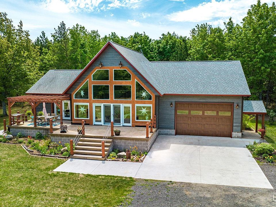 Stunning home and setting minutes from Houghton! This home is spectacular in so many ways. One look and it is quickly understood. The home boasts a large great room with 18' ceilings at the highest spot and outstanding views of the back yard and much of the main floor! The kitchen is very well equipped with a huge island, Rajala's Kitchens cabinetry, granite countertops, and pantry. There is a main floor bedrooms with closet and bathroom. The bathroom has a tub, tiled shower, and tiled floor. The rest of the main floor has a laundry/mechanical room and entry from the garage. The second floor has the second bedroom which is a loft which overlooks the great room! One of the focal points of the home is the incredible bannister/staircase which really brings the living area together. The attached garage is very nice and exceptionally functional. The garage is heated, has 16' ceilings, and the walls and ceiling are covered by corrugated steel. A couple of details also include the heated slab for the main floor and the outdoor wood boiler for back up heat (there is a pin hole in the water tank for the outdoor boiler. The seller just kept the water under the hole and it continued to work fine). The exterior of the home has been cared for so well. The deck/patio is raised above the ground and has 6" of concrete for the pad. The deck/patio stretches across the entire front portion of the home and is perfect for enjoying nature. The property is located just off of Gagnon Rd and is accessed by an easement of approximately 500 feet. This easement is maintained by the seller, but Gagnon Rd is maintained by Houghton County. The property is about 5 to 6 miles from the City of Houghton and all it has to offer. This is a special place to call home! NOTICE: All information believed accurate but not warranted. Buyer recommended to inspect property, verify all information & bears all risks for any inaccuracies. Tax information is subject to change.