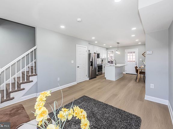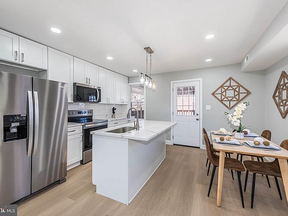 This beautifully renovated end-of-group home offers three spacious, fully finished levels with an open floor plan that maximizes space and natural light. As you enter the main level, you’ll be greeted by gleaming wood flooring that flows seamlessly throughout the living room and dining area, creating a warm and inviting atmosphere. The modern island kitchen is a true highlight, featuring elegant Quartz countertops, sleek stainless steel appliances, and ample cabinetry, perfect for both cooking and entertaining. Upstairs, you’ll find two generously sized bedrooms, each with plenty of closet space, and a luxurious full bath with stylish finishes. The finished basement adds even more living space with a cozy family room, an additional bedroom, and a full bath, offering versatility for guests, a home office, or a private retreat. Step outside onto the rear covered deck, a peaceful spot to relax or entertain, while enjoying the expansive, fully fenced yard—perfect for outdoor activities, gardening, or simply unwinding. This home offers a perfect balance of contemporary design, comfort, and functionality in a fantastic location.