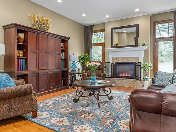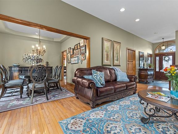 Enter the custom wooden and beveled glass front door and view the stunning family room with large windows, electric heater fireplace. Custom blinds, hardwood floors, Pella windows, pocket doors throughout. Eat-in kitchen has under cabinet lighting, touch faucet, large island with storage/outlets, granite countertops, gas cooktop, stainless steel appliances, maple cabinets. Formal dining room with wall of windows. 1st floor laundry room has added shelving. XL garage with 220 volt outlet. 3 bedrooms on main floor. Primary bedroom with a spacious closet and bathroom with double vanity, soaking tub and glass shower. Large patio is accessible via the kitchen and family room. Covered area of patio has gas and is perfect for a grill. Professionally landscaped, gorgeous yard with vinyl fencing and invisible dog fence. Downstairs is a huge, bright, walk out basement with tile flooring, carpeting, stone gas fireplace and wet bar. 4th bedroom and full bath is also downstairs. Lots of storage.