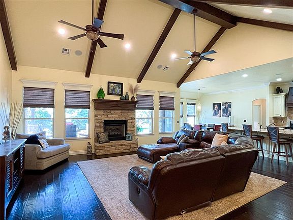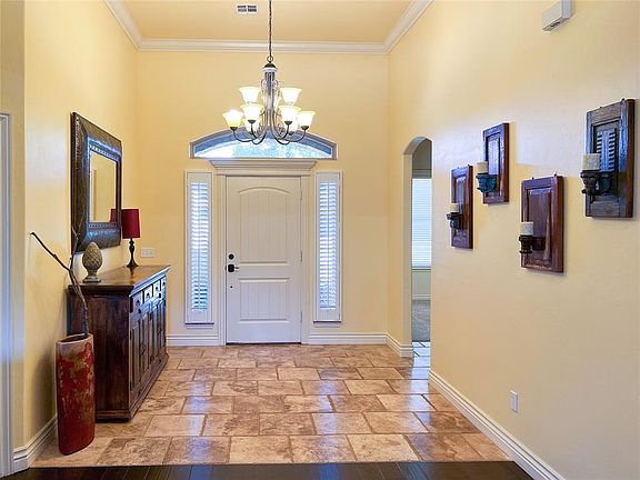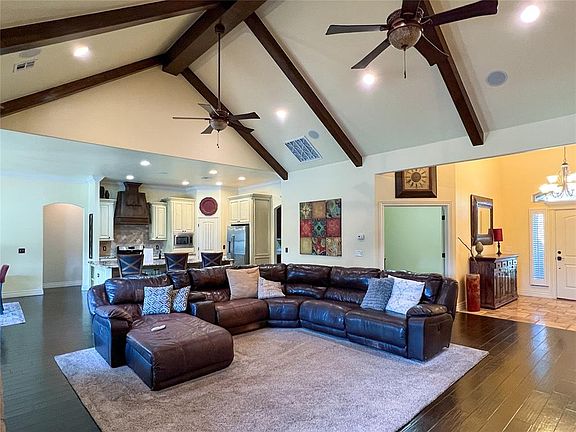 Wonderful Arbor Lakes Custom! Gorgeous Pool and outdoor entertaining area with a fabulous lodge look covered patio. 4 beds plus a study! Tall beamed ceilings in living area open to the kitchen with a huge granite island perfect for family gatherings and entertaining. Custom woodwork throughout! Large utility with mud bench. Jack and Jill bathroom with a sink on both sides. 3 car garage with Storm Shelter. Primary bedroom with large closet that wraps around to the utility. Sprinkler System and beautiful landscaping await! Call now for your private Showing!