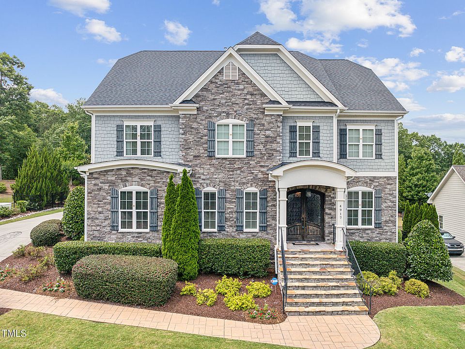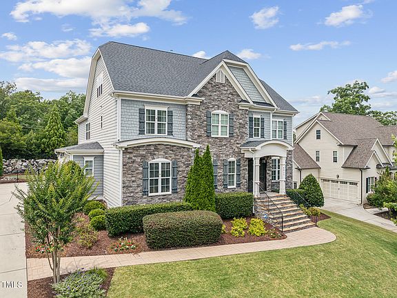 Welcome to this stunning stone-accentuated custom home located in the highly sought-after Hamptons at Umstead, a spectacular Raleigh location offering unparalleled convenience and luxury. With a neighborhood pool, clubhouse, and fitness center just steps away, this home provides an exceptional lifestyle. As you enter through the double front doors, you're greeted by elegant hardwood flooring and extensive millwork throughout the home. The Family Room is bathed in natural light and features a coffered ceiling, custom built-ins, and fireplace. This space seamlessly opens to a modern Gourmet Kitchen embellished with top-of-the-line SS appliances, Granite counters, tile backsplash, and center island with raised bar seating. The 1st floor also includes a private Guest Suite, Study with French doors, and an exquisite Dining Room. Upstairs, the Primary Retreat is adorned with a tray ceiling, luxurious en-suite bath, and an impressive WIC. The secondary bedrooms are spacious, each with full bath access. The 3rd floor is an entertainer's dream, featuring a massive Bonus/Game Room with a wet bar, a Theatre Room for movie nights, and a convenient half bath. Outside, the screened porch leads to a stamped concrete patio overlooking a meticulously maintained fenced backyard. Fitness Room, Garage with Epoxy flooring, New HVAC's, and much more!