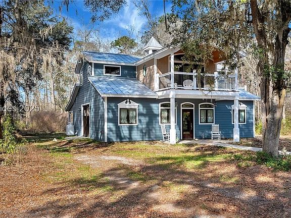 An exquisite 2 story 2400+ SF home perfectly nestled on a very private 13+ acre estate. Centrally located 15 mins from Savannah & Bluffton on High Ground in the Bellinger Hill area. This home has 3 covered porches and separate sun deck to view magnificent sunsets. The interior boasts of white knotty-pine walls with hints of amber grain in a deliberate style of late 1800's Victorian architecture. Estate also includes a fully equipped 1 bedroom cabin to accommodate friends and family. Estate also has a large chicken coop with run as well as 3/4 acre ready to plant garden with irrigation. This is a rare one-of-a-kind masterpiece. Back on the market to no fault of the seller, was under contract as a lease purchase.