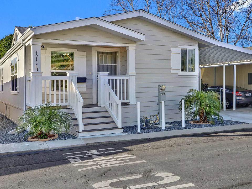 Welcome to The Cliffs, San Diego's premier 55+, (others 21+) manufactured home community, where this beautiful 3 bdrm, 2 ba, 1344 sq ft home awaits you. Built in 2020, this newer home boasts an adorable front porch, open floor plan with a spacious living room, kitchen, and dining area. The kitchen features a large island, quartz countertops, gas stove, and stainless steel appliances, perfect for the discerning chef. Large primary bedroom features a walkin closet, dual sinks, linen closet, walkin shower. Laundry room with full size washer & dryer. Central AC & Heat. The home is located close to the community center with swimming pool, spa & recreational activities, and additional guest parking. Conveniently located close to all amenities!