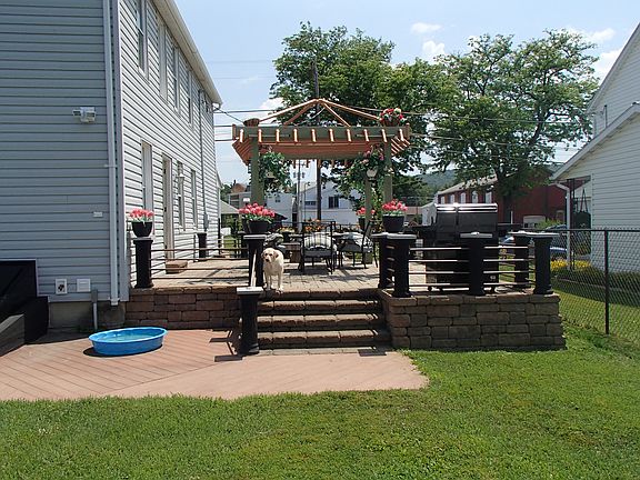 **GAS HEAT** 3 Bay garage! Last price reduction. This single well maintained 2 story home has an open floor plan on the 1st floor. It offers 2 bedrooms. Freshly painted throughout. There is a full basement that can be finished for additional square footage. You can sit on the custom built patio with unique pergola while listening to the waterfall of the pond. A 3 bay garage with electric which includes a sectioned off part currently used as a weight room however, these walls are not supported walls if you desire to remove them. This home has gas heat with high efficiency central air, water heater and boiler. The yard is fenced in for additional security of any children or pets. For those cool nights, there is an area to sit around with custom built benches and an upright fire place. There is plenty of storage on the 3rd floor or a bedroom for a young child. All appliances remain.
