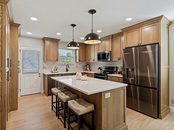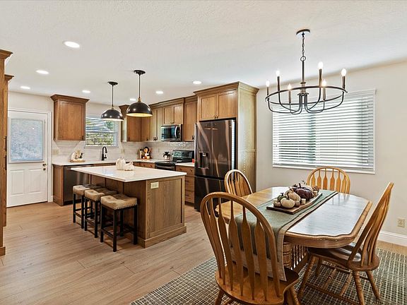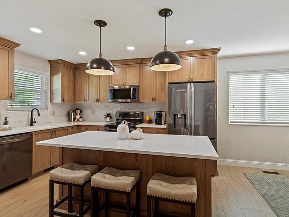Stunning remodeled designer kitchen with ceiling height, warm-chestnut color cabinetry, quartz countertops, a large island, and stainless steel appliances. The spacious primary suite features a private ensuite, while the finished basement offers a large great room with a gas fireplace. Enjoy shaded evenings on the new composite deck, plus plenty of storage with an RV pad, large shed, and a 284 sq ft semi-finished crawl space that is easily accessible and well lit. Meticulously maintained with attention to small details, including new paint, baseboards, newer HV/AC systems and roof. Move-in ready, this home is located in a darling neighborhood near HAFB and the aquatic center and provides the lifestyle you've been looking for!