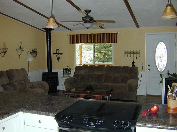 Over 13 acres of possibilities! Updated manufactured allows for comfortable living. The kitchen and living area have been modified into a great room setting with an open kitchen that features newer counters and appliances. Wood laminate flooring runs through the living, dining and kitchen. Nice use of color throughout. A propane stove in the greatroom helps offset heating bills. The main bath and master bath have both been updated with new flooring, the master has a newer shower and the main bath has a jetted tub/shower that s decked in tile and is set in an arched alcove. The master bedroom has a combination walk-in closet/sewing room that has been added. French doors lead from the dining area to the large raised deck that overlooks the stocked pond! The home was re-roofed and painted this year. A number of outbuildings offer storage and workspace. The insulated shop (formerly used to raise shitake mushrooms) is being used for automotive hobbies. It s 30X60 and has high doors so even a large RV can fit! A second structure can be used for multiple vehicle storage. The third has a temporary apartment in front and the back part had been used as a barn. There is a well on the property that could be used for gardening, the home is in Luckimute Water.
