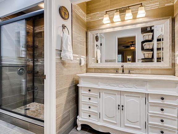 - Walk-In Closet(s), Separate Shower, Bookcases, Entrance Foyer, Hardwood Floors, Tile Bath, Tile Floors, Carpet, Recently Renovated