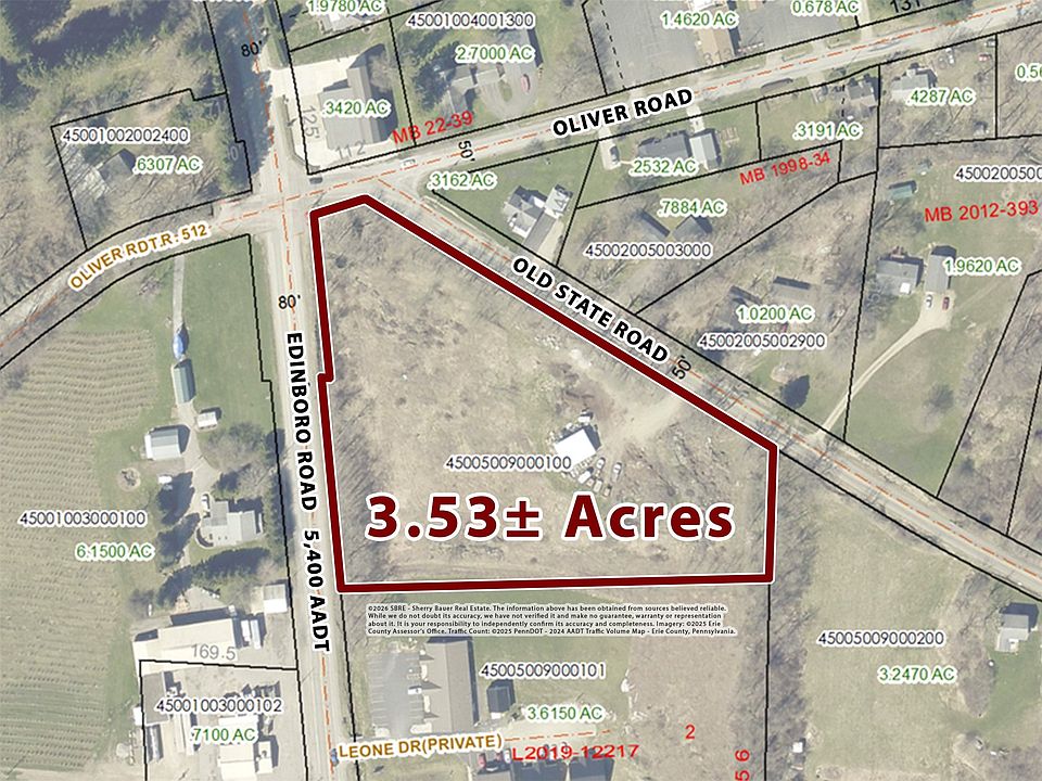 3.53± acre corner lot for sale in Washington Township. Ideal for commercial or residential development. Conveniently located between Edinboro & McKean and just 6.6 miles from I-79. Mostly cleared, level lot with perimeter mostly treed offering privacy. Features an existing 1,200± SF (30’ x 40’) pole building – built in 2001 – with 10’ x 9’ overhead door & 9’5” ceilings. Gas & electric available. Private well & septic buyer’s responsibility. Approximately 4.2 miles from Edinboro, 4.4 miles from McKean & 17.3 miles from Erie. 5,400 average daily traffic along Edinboro Road (PennDOT 2024 count year). Zoned B-1, Highway/Plaza Commercial District, offering many potential uses: retail, restaurant, office, service business, auto sales/repair, self-storage, single family home & more.