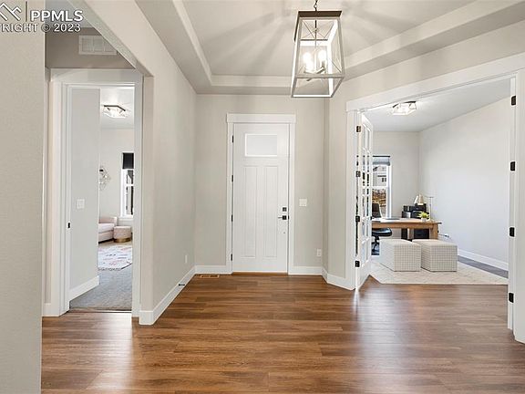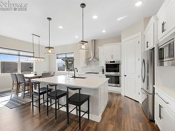 Elegantly designed ranch home by Desert Aspen Horizon View Homes. Stunning & expansive footprint boasting 4,400 sqft & 6-beds 4-baths w/ unobstructed views of Pikes Peak & Front Range! Covered porch leads direct into spacious entryway featuring 12 ft ceilings. Located off the foyer is office, 2-beds, & bath. Sleek & modern designed CUSTOM kitchen features luxurious quartz island w/ bar seating, pendant lighting, luxe quartz counters, built-in double oven, dovetail joint white cabinets, gas range with custom hood, cabinets with pull out drawers, built-in spice racks, under-mount composite sink. Primary bedroom adorned w/ attached 5-piece bath with a raised vanity to include granite counters, double sinks, a deep soaking tub, a shower with a mosaic tile in lay, plus walk-in closet. The basement family room features a media theater projector & surround-sound system, billiards for family game night, and gorgeous wet bar w/ storage galore. One basement bedroom is a junior suite and has an attached full bathroom and walk-in closet. Two other secondary bedrooms feature spacious closets & share an adjoining full bathroom plus fitness room. Spacious 3-car garage, improvements since completion just one years ago: professional landscaping w/fence, custom blinds, and more! MUST SEE property! Too many custom features to list! Amazing Location: Award winning Academy 20 school District, just 20 mins from downtown Colorado Springs & Peterson Space Force base, and 10 mins from Flying Horse private golf club. Schedule your private tour today!