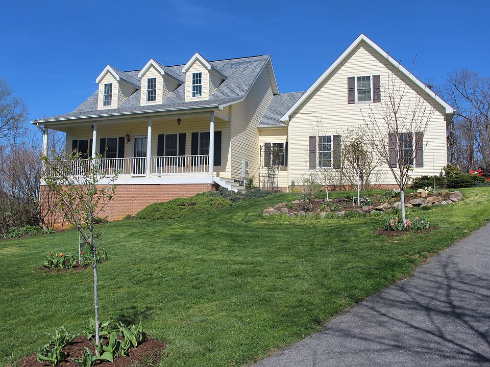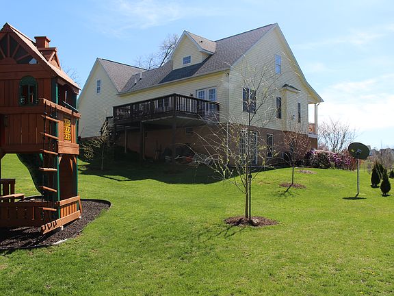 House is located on a cul-de-sac with mountain view with backyard woods. Finished basement includes walkout, wet bar, and half bath. 1st floor master bedroom with full bath, kitchen, living area, half-bath, and gas fireplace. 2 upstairs bedrooms with full bath and walk-in attic space. Large finished bonus room over garage. And cable ready. Exterior includes front porch , rear deck, and playhouse. Utilities include septic (system is a hybrid that incorporates a subdivision holding pond and managed by the county), water well, electric service includes 2-200 Amp panels (400A total for future expansion), and external propone tank. Extensive landscaping with various fruit and ornamental trees with backyard privacy. Lot is slightly larger than one acre.