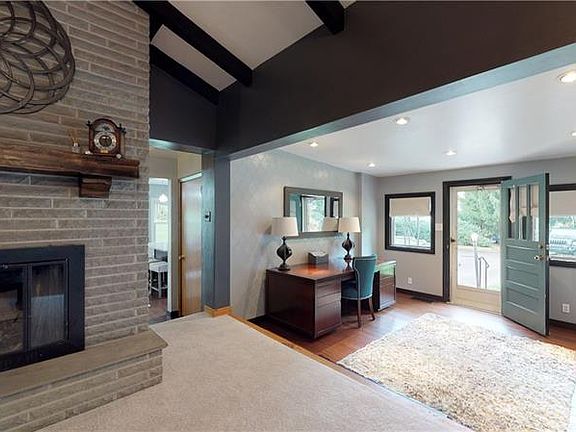 Walk into the open foyer and you will fall victim of the love spell that this bewitching bungalow will cast upon you. The earth tones and abundance of windows bring the outdoors in. The floors are adorned with new carpeting that is plush under your toes. The warm accent hardwoods in the entry, kitchen and hallways bring in a cozy cottage element . The main living space has high ceilings with wooden beams giving you a lofty feeling. Floor to ceiling stone fireplace and custom built-in shelving attribute to the homes personality. The master bedroom is roomy with a sizable walk in closet. The bathroom has a vintage feel that meshes well with the integrity of the home and features combined shower/bath, storage and double vanity. The showstopper of the home is definitely the newly remodeled kitchen. It has an abundance of cabinetry for storage, penny tile backsplash, solid surface counter tops, extensive prep space, an island with storage and seating and stainless steel appliances.