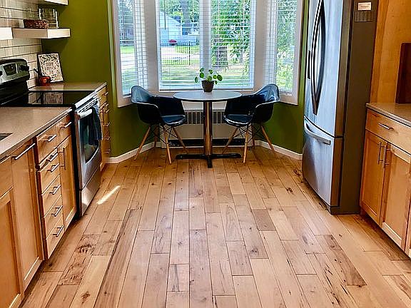 Fabulous location, just off South Shore, this 1 1/2 story home is nestled on an extra deep lot right near town, boat launches, and nature center. Fully fenced in private back yard features mature trees, pears and raspberries and endless possibilities. Great open floor plan with lots of natural light and many interior updates including completely remodeled kitchen and baths and hardwood hickory flooring. Main Floor bedrooms feature huge closets and hardwood floors. Spacious upper level bedroom features built-ins for tons of storage. Downstairs has a completely remodeled family room including a second fireplace. Other features include energy efficient ductless central air, drive through garage, new siding, updated plumbing, newer hot water heater. Recently appraised above asking price.