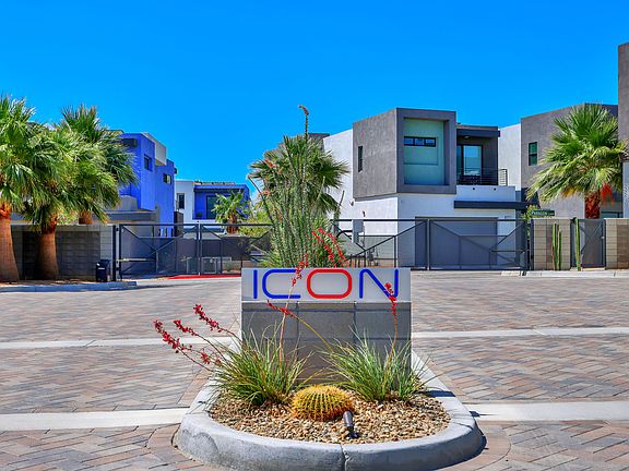 ICON, an intimate gated enclave built in 2018 of only 46 homeowners combining Palm Springs style with today's home elements, with spectacular mountain views on Fee land, minutes to downtown Palm Springs & a quick easy access to the 10 freeway. This Ebony floor plan home boasts nearly 2000 sq.ft. of open living space on two levels with 3 spacious bedrooms including one on the main floor (currently used as a den/office), 3.5 spa-like baths, multiple decks & outdoors lounging areas, an upstairs laundry room & walk-in closet in primary bedroom. This highly upgraded home offers polished concrete floors on the 1st level, impressive 8' solid doors, smooth drywall finish, custom paint treatment and tile work, a sleek kitchen featuring upgraded full slab door cabinets, Thermador appliances, quartz counter tops, a single basin stainless steel sink with Grohe high arch faucet and kitchen peninsula with bar seating. Enjoy additional peace of mind with a fully owned 5.2 kwh Tesla Solar System, a water softener, energy efficiency construction with R-38 roof and R-21 wall insulation & high efficiency 14 SEER rated A/C system. Outdoors, relax and/or entertain in your private fully enclosed and private backyard with a pebble pool /spa with remote access to heater/filter/spa controls & an outdoor shower. This property comes with a 2-car garage (upgraded garage door) with WiFi opener, a private backyard gated access & spectacular panoramic vistas ...this is a great value not to be missed!