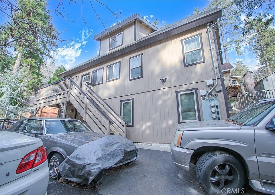 Beautiful Triplex rebuilt in 2015 with a total of 4 Bedrooms and 4 Bathrooms set in the picturesque mountains of Crestline. As you arrive you will notice the plethora of level parking 2 cars wide in the main driveway and a second driveway allowing plenty of parking for all three units surrounded by beautiful mature trees. Once inside Unit 1 you will enjoy the open floor plan with the Living room opening to the Kitchen, a Bedroom and Bathroom with a walk in shower on the main level. Upstairs you will find the Master bedroom with a Master Retreat at the top of the stairs with hooks up for a washer and dryer, an oversized walk in closet, and a Full Bathroom complete with a tub/shower combo. Unit 2 features a Living Room that is open to the Kitchen with 1 Bedroom and 1 Bathroom all on one level with wood floors. Unit 3 has level access from the parking, a living room that is open to the Kitchen with 1 Bedroom and 1 Bathroom all on the bottom level of the triplex. All 3 units have upgraded wood cabinets in the Kitchen and Bathrooms. The Bathrooms feature vinyl flooring and all have shower/bath glass enclosures. There are ceiling fans with lights in the Living rooms and Bedrooms of all three units. There are 3 electric and 3 gas meters. Each unit has central heating and separate water heater. The triplex is located in a amazing area of Crestline right around the corner from the shops and restaurants on Lake Drive. Don't miss this great opportunity for an investment with a rare to find Triplex rebuilt in 2015!!!