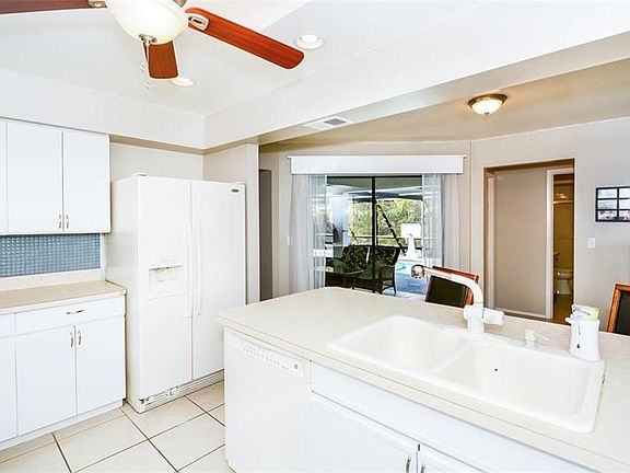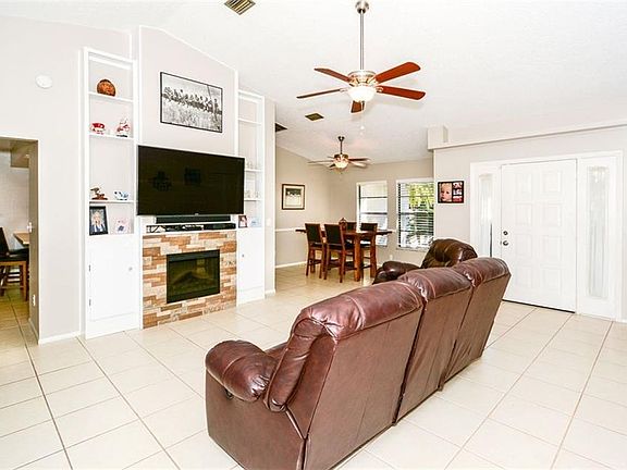 The search is over! Nestled on a cul-de-sac street amongst the majestic oaks, you'll feel at home the moment you step in the door. Open and light, inviting interior with vaulted ceilings and easy maintenance tile floors flow throughout. A charming electric fireplace with built-in shelves frames your living room and pocket sliders open to the covered lanai and pool deck. The kitchen with skylight has a breakfast area that overlooks the lanai, and adjoining utility/laundry room. Your Master bedroom boasts a private bath, 2 walk-in closets and sliders open to the lanai. Split plan with generously sized 2nd & 3rd bedrooms, one offering a large walk-in closet with shelving perfect for crafting or office space. Enjoy the large saltwater heated pool year-round, screen enclosed with ample covered space to entertain. The backyard is private and fenced with a variety of trees including starfruit, citrus and bananas. Manatee Oaks has a desirable location for commuting, along with plentiful shopping options and nearby movie theater.