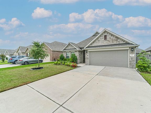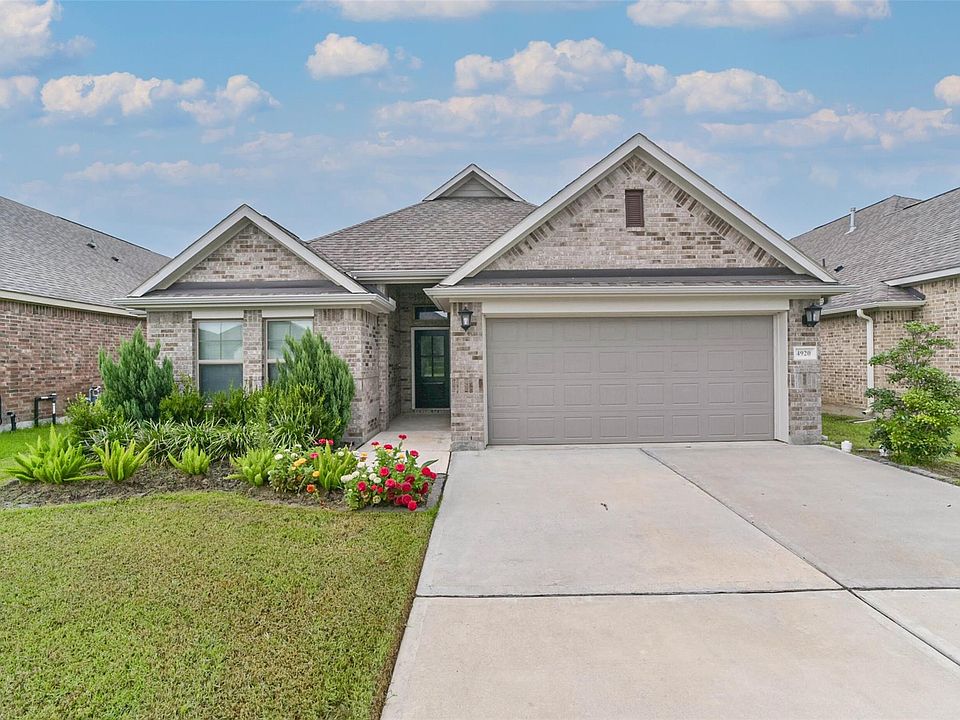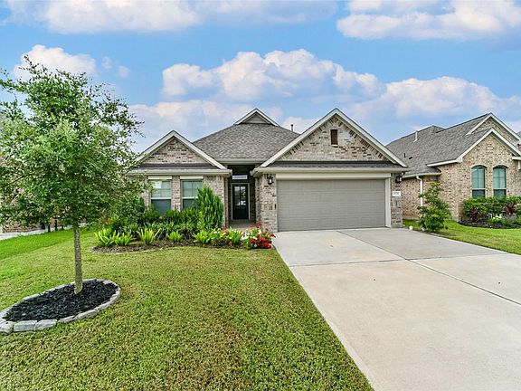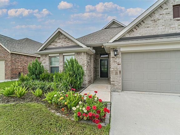 Welcome to your new home in the beautiful Coastal Point community! With it's high ceilings, & luxury vinyl plank flooring, this open floor plan with a combined family room, dining room, & oversized kitchen island is sure to please. This kitchen is stunning with its quartz counters, a designer tile backsplash, a farmhouse sink, slate stainless appliances including a gas cooktop, & a walk in pantry. This 2020 Empire floor plan has 4 bedrooms, owners retreat with his & hers sinks, a soaker tub, seamless glass shower & a large walk-in closet. Other features include indoor speakers, leased security system and workbench in garage. This master-planned community boasts amenities that include a resort-style pool & clubhouse, ponds, parks, & walking trails and it is minutes from Kemah Boardwalk & Galveston. Exterior features in-ground lawn sprinkler, gutters around entire house, outdoor speakers and covered patio. **Refrigerator, washer and dryer included.