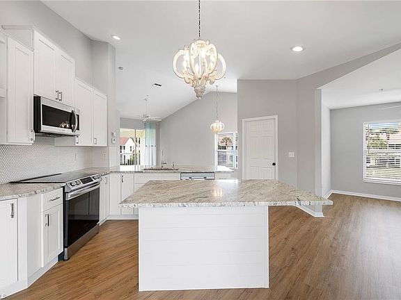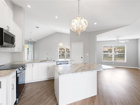 This spacious second-floor condominium has two bedrooms and a den plus two full bathrooms. It features all new kitchen cabinetry with tile backsplash and granite countertops with an island that has counter seating for eight; volume ceilings and two lanais - one screened and one open. Because it's an end unit, the condominium is filled with natural light. The entire condominium has been freshly painted and new luxury vinyl flooring installed throughout. Other features include a newer AC and a covered carport just outside the front door. Ideally located in North Naples, Carlton Lakes is a short distance to Publix and Seed to Table, a grocery store with multiple dining options, and just a few minutes' drive to our beautiful white-sand beaches. The clubhouse at Carlton Lakes offers bocce courts, Har-Tru lighted tennis courts, tot lot, 60-foot lap pool, fishing pier and a fitness room.