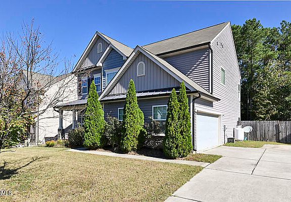 Gorgeous Move-In Ready Home with First-Floor Guest Suite and Loft! Welcome to this stunning home, perfectly situated on a large, private yard that is fully fenced and backs to trees. From the welcoming front porch to the rear patio ideal for outdoor living, this property is designed for comfort and enjoyment. The main level features a highly sought-after first-floor guest suite with a full bath. A formal dining room, accented with hardwood floors and crown molding, offers a wonderful place for gatherings or can easily serve as a home office or flex space. The heart of the home is the open-concept living area, where the living room, complete with a cozy gas fireplace, flows seamlessly into the gourmet kitchen and breakfast area. The kitchen is a chef's delight, boasting stainless steel appliances and beautiful granite countertops. Upstairs, a versatile loft provides the perfect spot for a game room, media space, or a second office. The luxurious primary suite is a true retreat, featuring a dramatic vaulted ceiling, a spacious walk-in closet, a relaxing garden tub, and a separate shower. Practical needs are met with an oversized concrete driveway and a 2-car garage, providing ample room for parking and storage. Located in the Rockbridge community, which offers a neighborhood pool, and zoned for desirable Wake County Schools. With convenient access to shopping, dining, and Raleigh, this move-in ready home is a must-see!