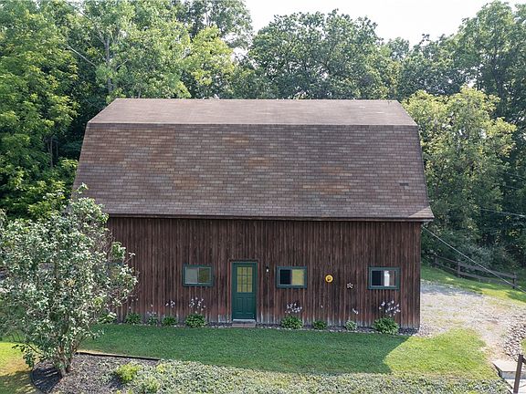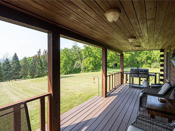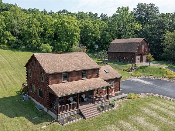 WOW! A truly stunning log home located on over 18 acres in the Geneseo School District. This private wooded oasis has so much to offer. Walking up to the covered front porch, take in the views overlooking the yard and woods. On the first floor begins with a living area, half bath, eat-in kitchen with French Doors going out to the back deck. Off the kitchen, is a stunning great room with vaulted ceilings, a sliding glass door, and a pellet stove (2022), perfect as an additional living area. Upstairs are 3 generously sized bedrooms and a full bathroom also accessible from the primary bedroom. Updates throughout the home include Andersen Windows (2017 transferrable warranty ), gutters (2018), furnace/ac (2011), and roof on home (2006). The garage/barn has so much to offer with 2 large bays, electrical service, and 900 sq ft of storage in the attic. 6 of the 18 acres include the maintained yard, 20x50 garden, and trails throughout the woods. Up the hill behind the house, is a pond stocked with bluegill & large-mouthed bass with a windmill aerating the pond. Don't miss out on this opportunity!