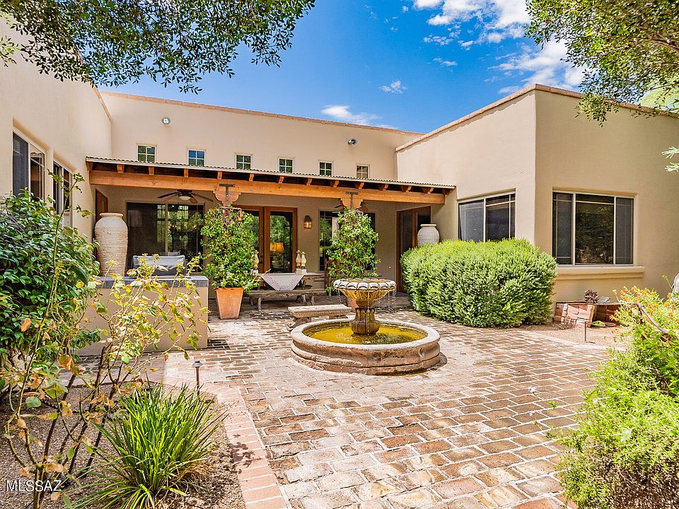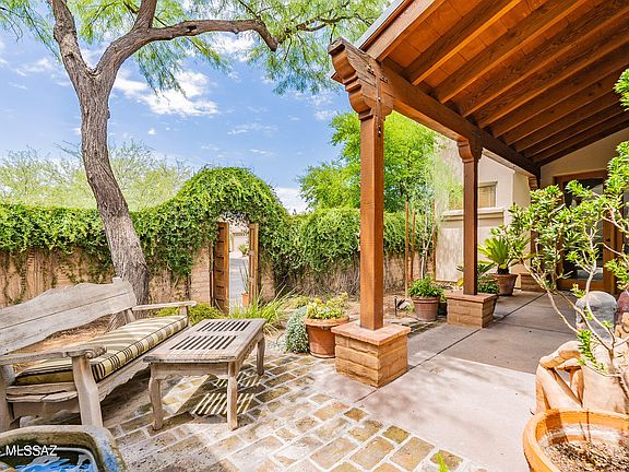 Rare opportunity to own this Old World charming gated property in the Historic Ft Lowell corridor. Caressing the character of the area with adobe court yards ,high beamed ceilings, concrete floors and fireplaces inviting authentic Tucson living. Formal living /dining room adjacent to fabulous kitchen /great room.3 spacious bedrooms, one used as office.Doorways out to courtyards from every room.Wonderful back yard with covered porch, mature vegetation , fireplace and built in cooking area.Add to it an oversizes 2 car garage and you are home!
