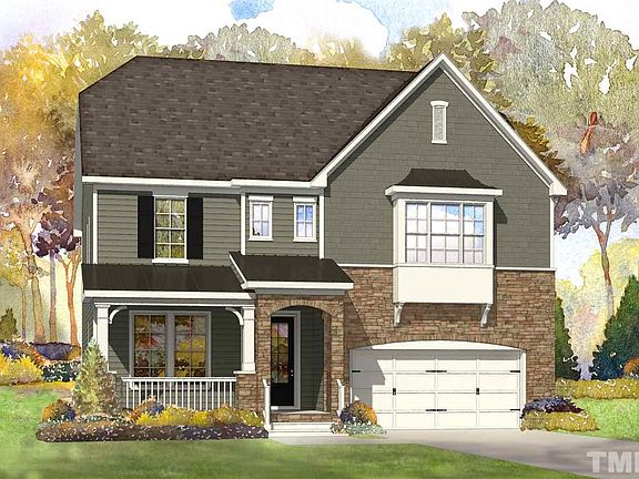 Robuck Homes Greystone plan with stone detail and large rocking chair front porch. Guest suite on first floor and large kitchen with double island great for the cook in the family. Light cabinets and gar range. Kitchen opens to large breakfast room and nice size family room. Large master suite on 2nd floor along with two bedrooms and full bath and loft great for a game room. Screened in porch overlooks trees and natural area in back and side yard.