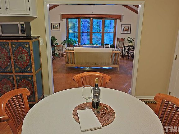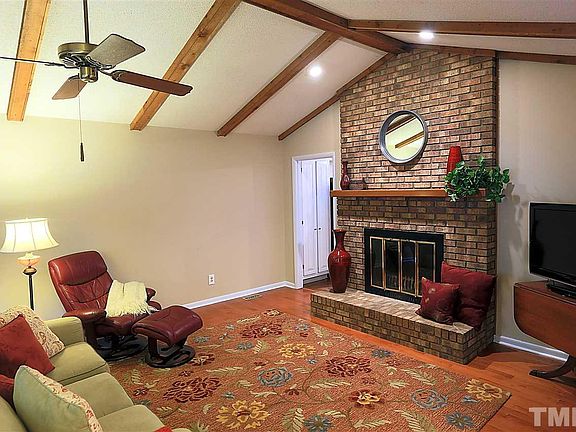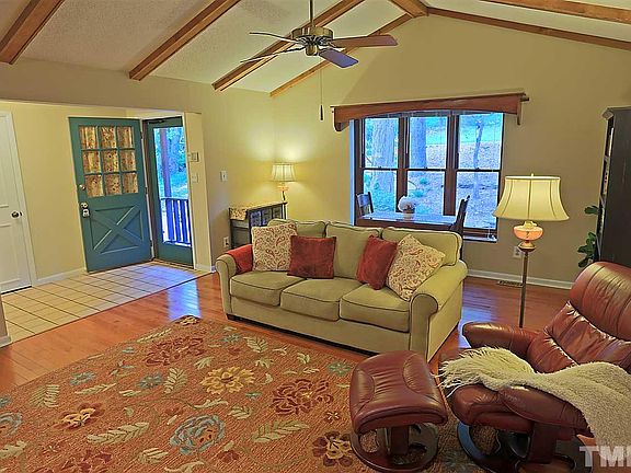 Nestled into the woods in popular Oak Park, this home has hardwoods, vaulted ceilings with exposed wood beams, large windows in sunroom and decks over-looking private yard and stream. Huge walk-out finished basement with kitchen area, full bath and separate entrance making a perfect in-law suite. Landscaped, fenced back yard with shed. New HVAC & water heater. Walk to Crabtree Greenway Trailhead, Oak Park pool, restaurants & shopping on Glenwood. Prime, central location near Crabtee Mall. MUST SEE!