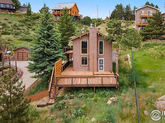 Welcome home to this incredible three-bedroom, two-bath 3 car garage property just minutes from Fort Collins. It's perfect as a weekend getaway or a year-round residence, with breathtaking views of Horsetooth Reservoir right from your doorstep. Enjoy easy access to hiking and mountain biking trails, as well as recreation on Horsetooth Reservoir. The property features a huge multi-level deck, open floor plan with vaulted ceilings, and vinyl siding. The lot extends from road to road, ensuring privacy with no neighbors behind. There's a second garage with finished space above, ideal for a detached bedroom rental or a fantastic billiard room. The property includes a Tesla solar system with 4.9 kW panels on the garage and house roofs, keeping utility costs down to about $27 a month