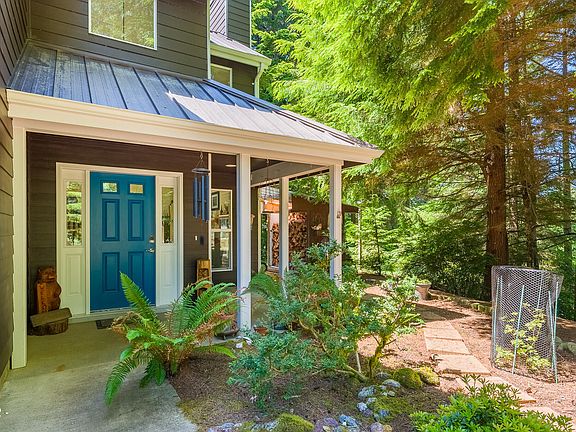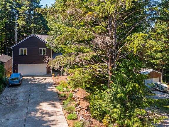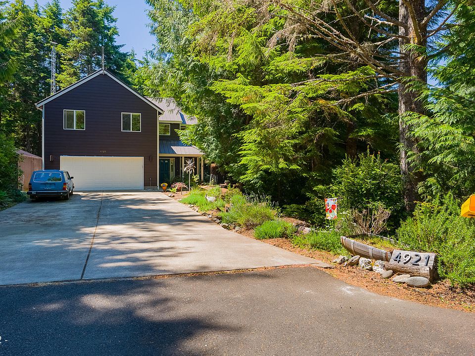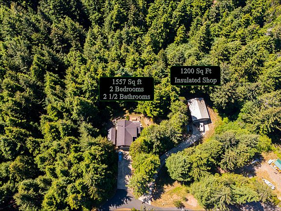 Hear the ocean through the trees on an almost 3-acre natural wonderland with a feeling of privacy & seclusion in a spacious neighborhood yet just a short drive to town & beaches. This unique home features forest views & natural light throughout, open kitchen, wood burning fireplace & hardwood floors in living room. Newly installed Starlink antenna with fiberoptic run to the small workshop & music room. Large intelligently built garage/shop with electric & water is perfect for your RV & toys.