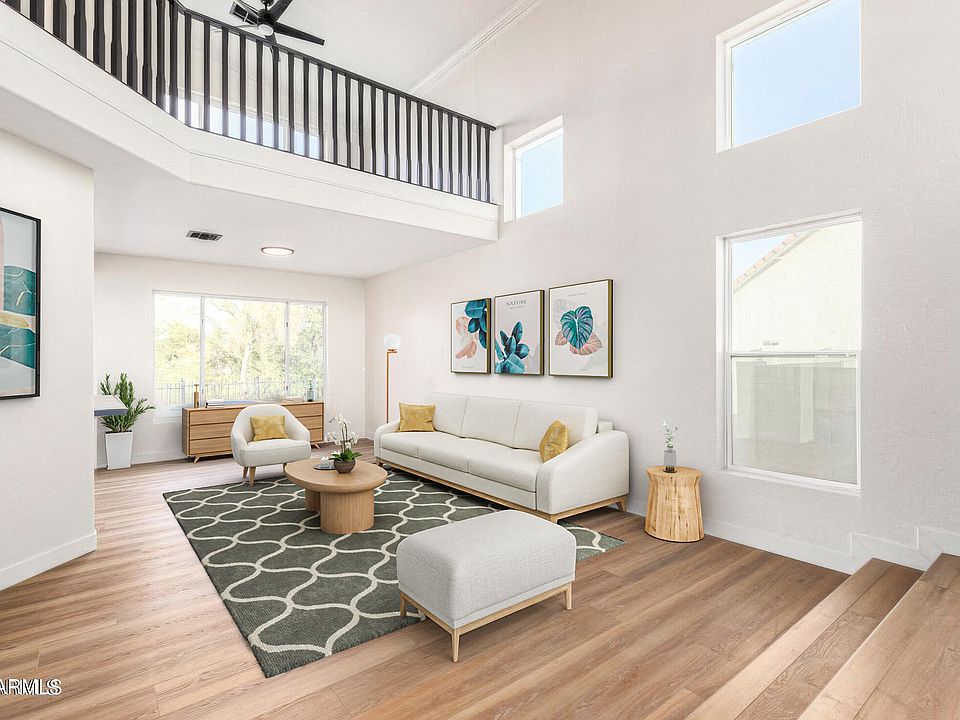 Discover your perfect home on a cul-de-sac lot overlooking the 9th hole of the AZ Grand Golf Course! Recently updated with exquisite luxury vinyl plank flooring, new HVAC and paint throughout, this 2-story retreat exudes elegance. Tall ceilings and natural light flood the great room as you enter the home. The window-lined kitchen offers panoramic views of the sprawling backyard and golf course. Step outside to your private paradise where a sparkling pool and spa await. With 1 bedroom and full bath located downstairs, hosting guests or accommodating multigenerational living is a breeze. You'll love the primary suite's private balcony with views of the course and nearby mountains. Located near the highly sought-after Ahwatukee area!