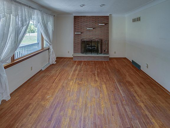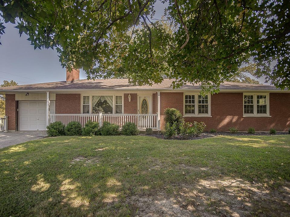 This is one of those solid all brick ranch homes with the best of bones! 3 bedrooms, 1 full bath on a 4 acre double lot. Beautiful original hardwood floors in all rooms except kitchen area/bathroom. Large kitchen with lots of cabinets and breakfast bar. Living room has a nice wood burning fireplace with accent builtin concrete shelves. Full, unfinished basement ready for you to turn into how you please! Property has a concrete outbuilding with a lean-to attached and HUGE fenced in field for horses, cattle, etc. (One side of fence is currently down as adjoining neighbor is using it as an grazing area for his cattle but will be put back up if new owner requests). Driveway starts out as asphalt and has stamped concrete area in front of finished garage with added parking spaces. The property goes all the way back to the woods!