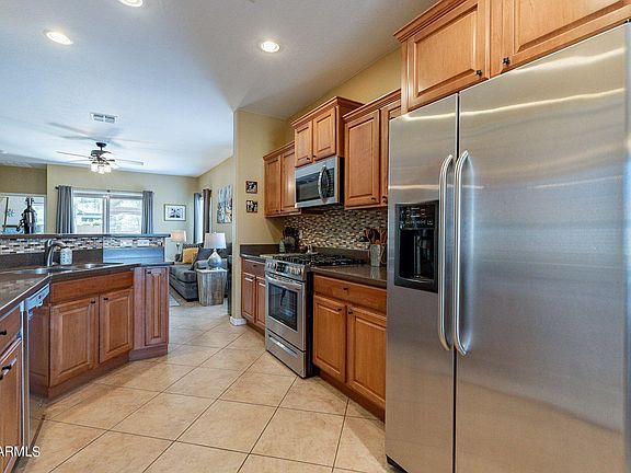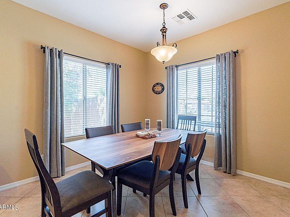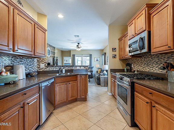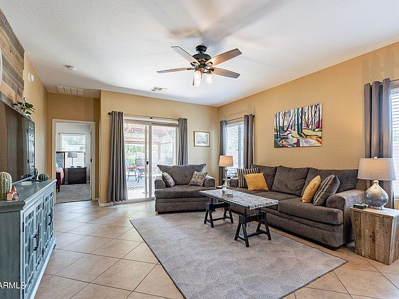 Come see this light and bright 1,638 sq ft home with 4 beds, 2 baths, and a spacious great room. Features include stone veneer, designer tile, high ceilings, and neutral tones throughout. The kitchen has a breakfast bar, mosaic backsplash, stainless appliances, and Corian counters. The primary suite includes a large walk-in closet and dual sinks. Enjoy a low-maintenance yard with a covered patio and mature trees. Community amenities include parks, paths, and mountain views. Low HOA.