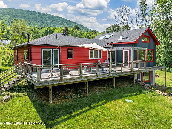 Built just above the tranquil Batavia Kill that flows year-round, this exceptional rustic contemporary residence offers nearly two acres of superior living environment in a well-designed package for those who appreciate finer living. The home features three spacious bedrooms, plus an option for a dedicated home office or flex space, and two full bathrooms—ensuring optimal comfort and privacy for every member of your household. A remarkable extension (2016) adds exposed beams, reclaimed-wood, rich cherry flooring, and expansive glass windows that capture the untouched mountain views while introducing a sophisticated modern aesthetic. This extension brings the total livable square footage, including the new lower level, to 1,720 sqft. And, for an added touch of connection to the land, the posts and railings are constructed from trees harvested on the property. The kitchen is appointed with premium appliances, concrete countertops, and a distinctive live-edge center island—creating an ideal environment for gatherings and entertaining while preserving the workflow for culinary enthusiasts. Located within the desirable Denver-Vega valley, this property is a combination of scenic views, coveted privacy, and an authentic Catskill living experience. Imagine yourself, cool beverage in hand, as you step out onto the generous back deck. Take in the aroma of the grill, amble down the stairs to the level lawn and play alongside the babbling Batavia Kill brook. The mountains create a breathtaking natural frame for this refined sanctuary—a residence that may quickly become your favorite escape. As an added benefit, this property has rights to a much-sought-after membership in the exclusive Roxbury Run Country Club offering access to private amenities such as a pool and tennis courts (to be negotiated separately, and annual dues and fees apply; details available upon request). Ideally positioned minutes from Roxbury & Margaretville, and 2.5 hrs from New York City, this property is a rare opportunity to secure a high-performing asset in the Catskills' real estate market. Claim your retreat—an investment in relaxation, enduring value, and the classic Catskill lifestyle.