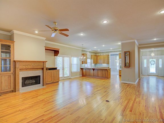 One Story Patio Home w/Bonus room up ! Gated small intimate neighborhood in Jenks Southeast Schools. Open floor plan with 3 bedrooms down . Spacious kitchens opens to large family room with built ins & gas fireplace . The kitchen has several cabinets for storing and plenty of room for cooking and entertainment . Gas Stove , Pantry , “Eat In” , plus opens up to formal dining with large window providing a lot of light . The Wood floors at long hall entry , family , kitchen and powder bath are beautiful ! The master suite has high ceilings , extra window for natural lighting , two big walk in closets opens into master bath with double sinks , jacuzzi tub & separate shower . The other two rooms share a Jack -Jill bath and all rooms have walk in closets . The utility room has sink and built in ironing board . The two car garage has built ins with new garage door. There is a bonus room upstairs plenty large for bedroom or game room. The door to patio is off of the family room to the low maintenance backyard . Floored attic , ample storage , all appliances stay , One Owner . Easy location to Hwys, stores , Fine dining . Location is great!!! Must see this rare find ! HOA covers lawn maintenance, fertilizing, weed control, fall leaf blowing, water in common areas, gate and phone service.