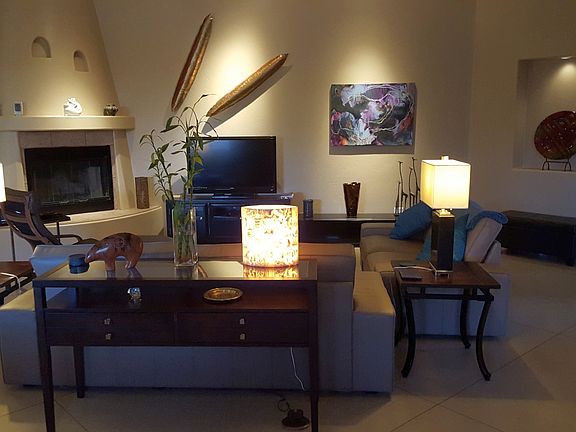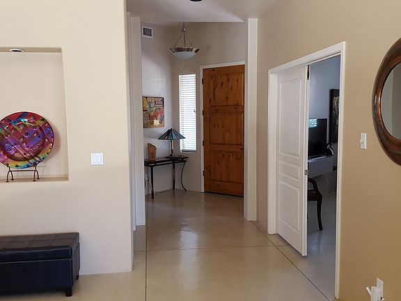 Fabulous home in the Parade Ground! Truly immaculate inside & out! Very private lot in a cul de sac adjacent to the Alamo Wash & pretty trees. Great Room concept, open light & bright! All concrete floors throughout! Corner fireplace w/ gas logs. Wonderful kitchen has center island/breakfast bar, tons of cabinet/ counter space. Granite counters, SS appliances. Spacious dining area. Great Room opens to the yard & covered patio Outside is an oasis! Grass for pets/kids, fire pit, stunning lighting, ramada, built in bar area...beautiful pool/spa. Perfect for relaxing and entertaining! Split BR plan, Den could be a 4th BR. Lovely master suite. Huge oversized garage has incredible storage! Beautifully maintained & upgraded home/yard! See Upgrade List under Documents. A Treasure!