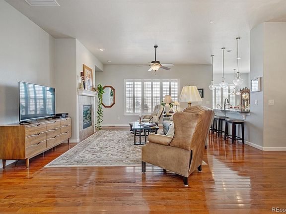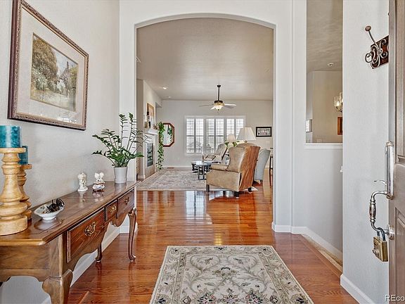 Located in the premier Anthem Ranch community for adults 55+, this meticulously maintained ranch home offers an open floor plan to fit your every need. You are greeted by gleaming hardwood floors and high ceilings that lead into a spacious family room with a cozy gas log fireplace. There is a formal dining area which flows into the huge eat in kitchen where you will appreciate the sunshine filled breakfast nook. The kitchen is complete with granite counters, tile backsplash, beautiful cabinetry with pull-out drawers, gas range and oven, stainless steel refrigerator, prep island and a large pantry. The main level laundry offers an abundance of cabinets and closet storage space. The primary bedroom offers its own luxurious, private 5 piece bath with custom tile, a step in shower, soaking tub and a huge walk in closet. There is access to the low maintenance, elevated deck from both the primary bedroom and the kitchen to enjoy the morning sunsrises or dining al fresco in the evenings. Don't miss the phantom screen door on the bedroom access door to the deck and top down blinds. The second bedroom, another full bath and an office/craft room are additionally located on the main level. This could also serve as a 3rd bedroom. Plantation shutters throughout allow you to let in all of the Colorado sunshine at your discretion. Interior paint was completed just 5 years ago and exterior paint in 2019. And if all of this isn't enough~ there is a full, unfinished, garden level basement to add to your living space. Come see this spectacular home and enjoy the active lifestyle that Del Webb's Anthem community offers. There are over 48 miles of open space, trails, a fantastic recreation center with indoor & outdoor pools, tennis & pickleball courts, activities, fitness center and more. Resort style living at your doorstep!