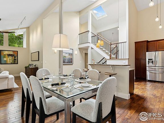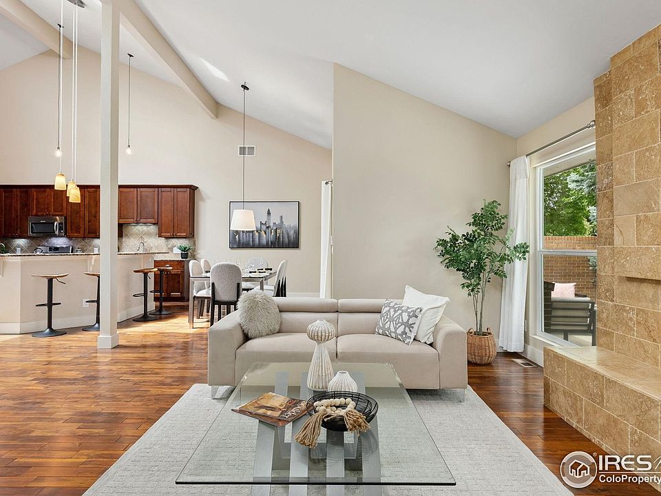Nestled just moments from the Boulder Country Club, this beautifully updated end-unit townhome welcomes you with soaring vaulted ceilings, abundant natural light, and rich hardwood flooring that flows throughout the main living areas. The open-concept main level is perfect for both relaxed living and entertaining, featuring a sleek kitchen with granite countertops, stainless steel appliances, and modern light fixtures. Thoughtfully designed for comfort and privacy, this home offers three spacious bedrooms on the main floor, including a beautiful primary suite ideal for single-level living. Upstairs, you'll find a private fourth bedroom complete with an ensuite bath-an ideal retreat for guests or extended family. The private back patio offers direct access to a tranquil greenbelt, providing a scenic extension of your living space. -ideal for quiet mornings or evening gatherings. The expansive unfinished basement provides exceptional space for customization, whether you're envisioning a home theater, fitness studio, or additional storage. Laundry is currently in the basement, but hookups are available on the main level. Enjoy the convenience of being close to walking trails and just a short drive to downtown Boulder and the charming town of Niwot. Zoned for either Fairview or Boulder High School. This home perfectly balances peaceful surroundings with access to the best of the area.