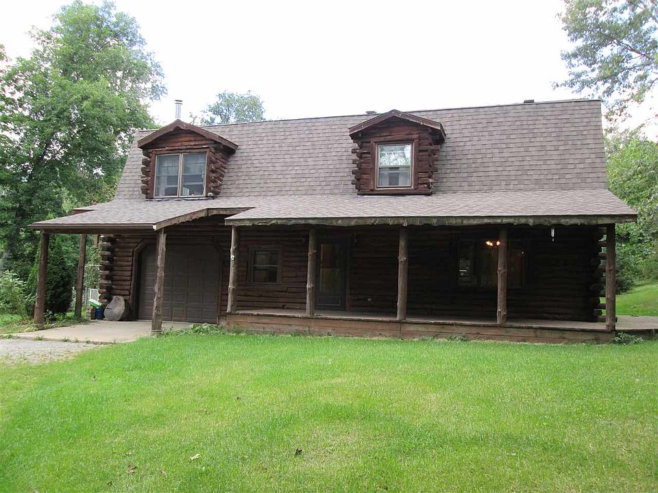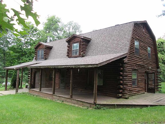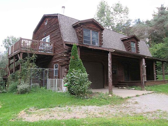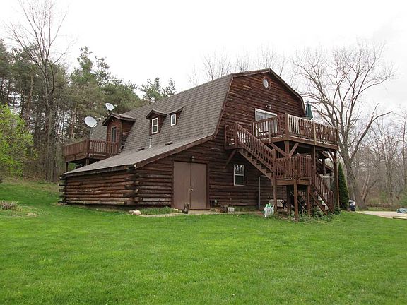 Rare opportunity to own a log home in a perfect secluded setting. Outside you have 3 useable acres with woods in front and open area in the back. A big open porch and 2 separate decks, one off the master suite and one off the family room. Concrete approach to the garage and for parking. Dog kennel with access to the garage. Inside is a large, open floor plan with living room, dining room and kitchen for entertaining decorated with warm colors. Upstairs are 4 bedrooms including a master suite, office and family room with a wood stove, wet bar and cathedral ceiling. So, in the summer sit on your swing on the big open porch or enjoy a campfire in the backyard. In the winter sit in the cozy family room by the fire and watch the snow come down. Plentiful wildlife, deer and turkeys.