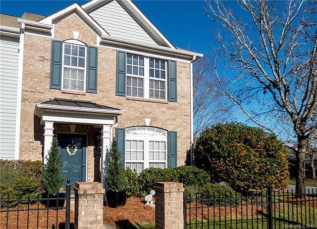 Stunning 2-story 2 Bedroom 2 1/2 Bath Townhome located in growing Prosperity Village! Brick front on Large Corner Lot with fenced-in wood deck and storage shed. Extra windows make this home light & bright! Meticulously maintained. Rich hardwoods. Freshly painted. Ceiling fans. Large Great Room. Kitchen has upgraded wood cabinets with pull-outs, quartz countertops and stainless steel appliances. Dining area has extended Bay Window...great for entertaining. Upstairs features nicely sized 2 master suites... one has deep tray ceiling, deluxe bath with garden tub and walk-in closet. Charming sunroom with tiled floor overlooks the wood deck. Upgrades galore! Dual refrigerant on HVAC. Custom landscaping. Close to the pool. Excellent location -walking distance to new restaurants and shops. Just minutes to I-485!