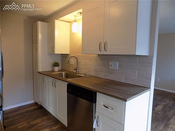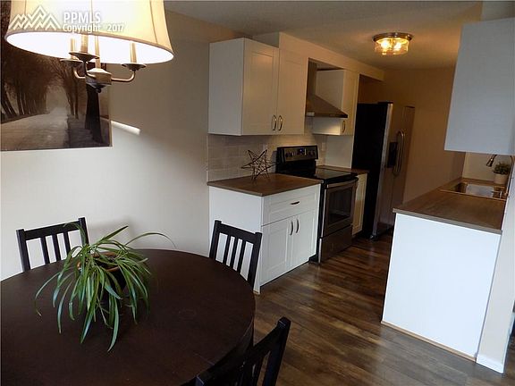 Complex is currently getting a new roof and deciding on new paint. Updated home ready for you to move in with designer style stamped throughout. Brand new: paint, counters, lighting, wood floors, carpet, tile, kitchen cabinets; stainless steel dishwasher, stove, refrigerator and hood vent. Also a brand new Carrier furnace just installed! Enjoy the mountain range from your master bedroom and the ease of townhome living. Central location gets you to Powers/Academy quickly!